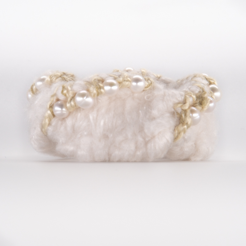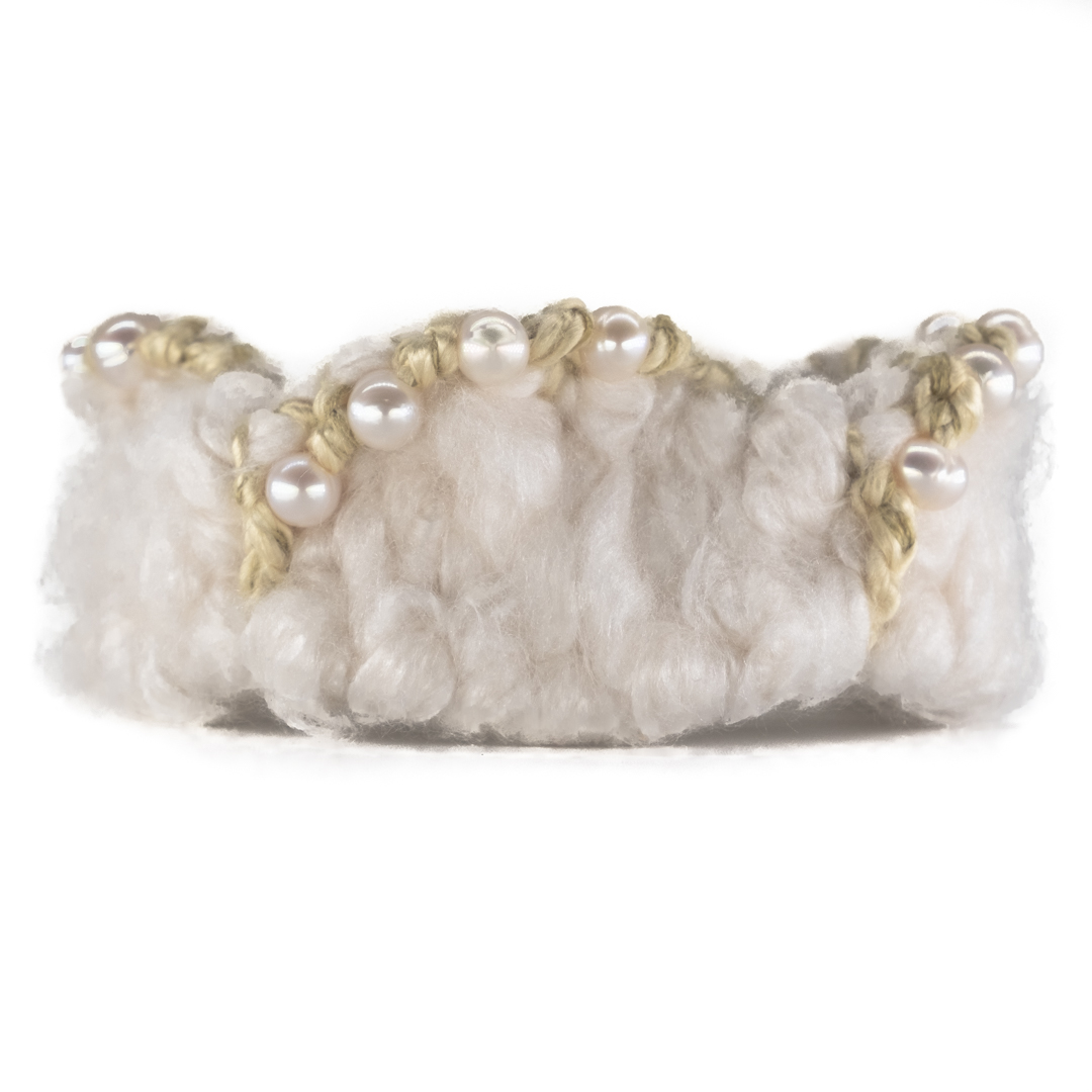 Ein Außergewöhnliches Schmuckstück, die Entfaltung der Blütenblätter einer Lilie. Ein geschmeidiger, goldfarben-grünlicher Faden, gebildet aus den obersten Schichten eines Seidenkokons, schnürt eine weisse Wolke ein.