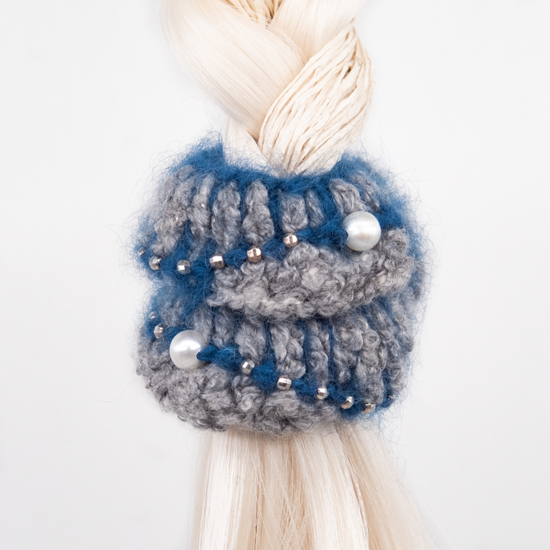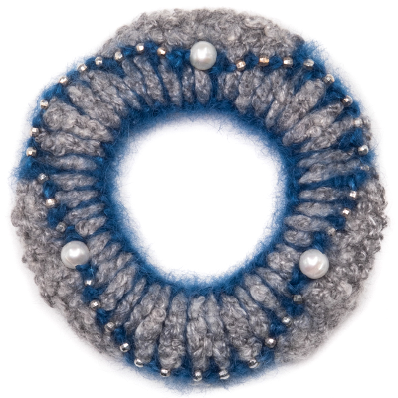 3 Perlen. Zwischen ihnen funkeln 12 kleine Silberperlen. Materialien: Seide und Mohair.